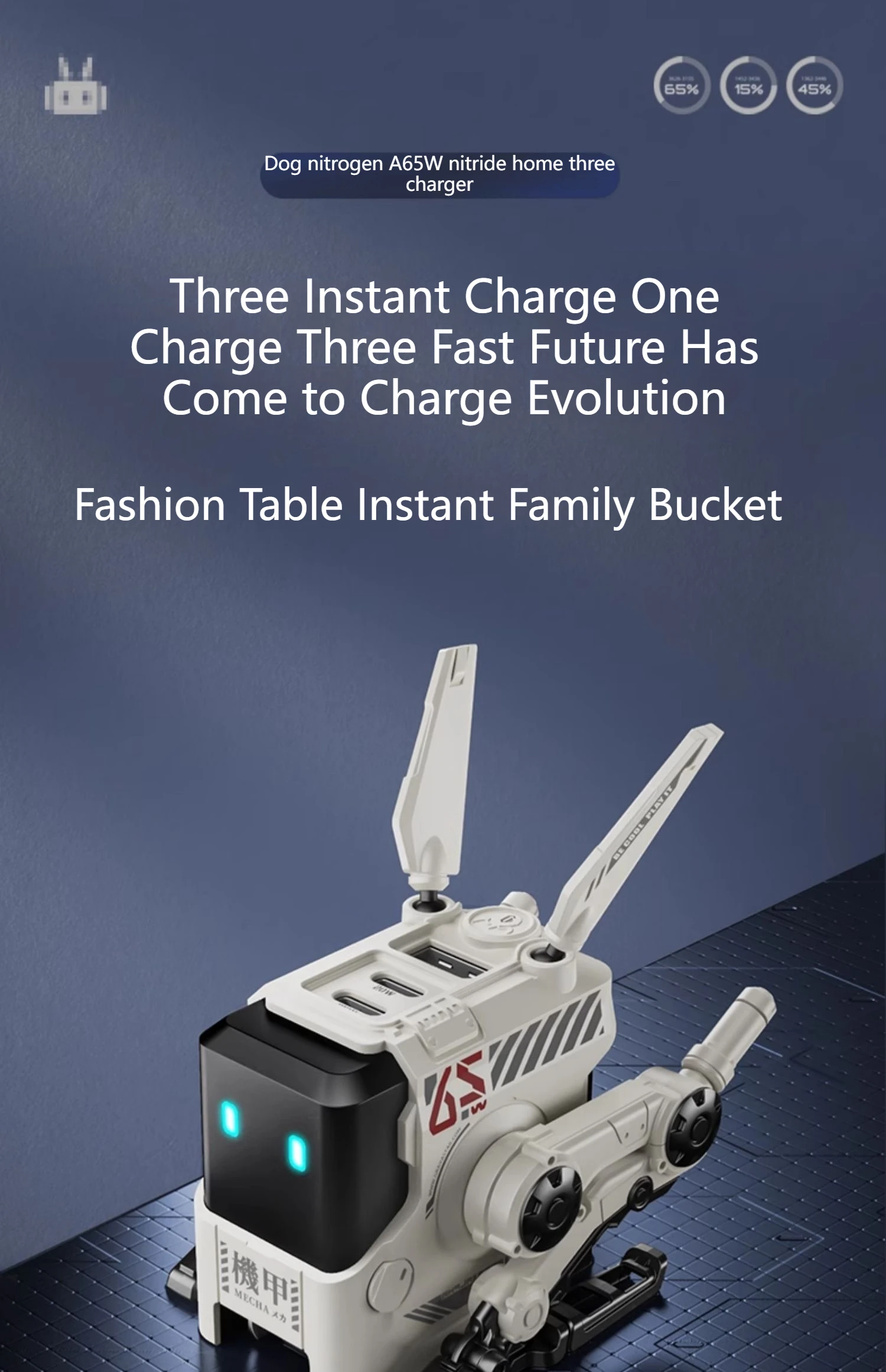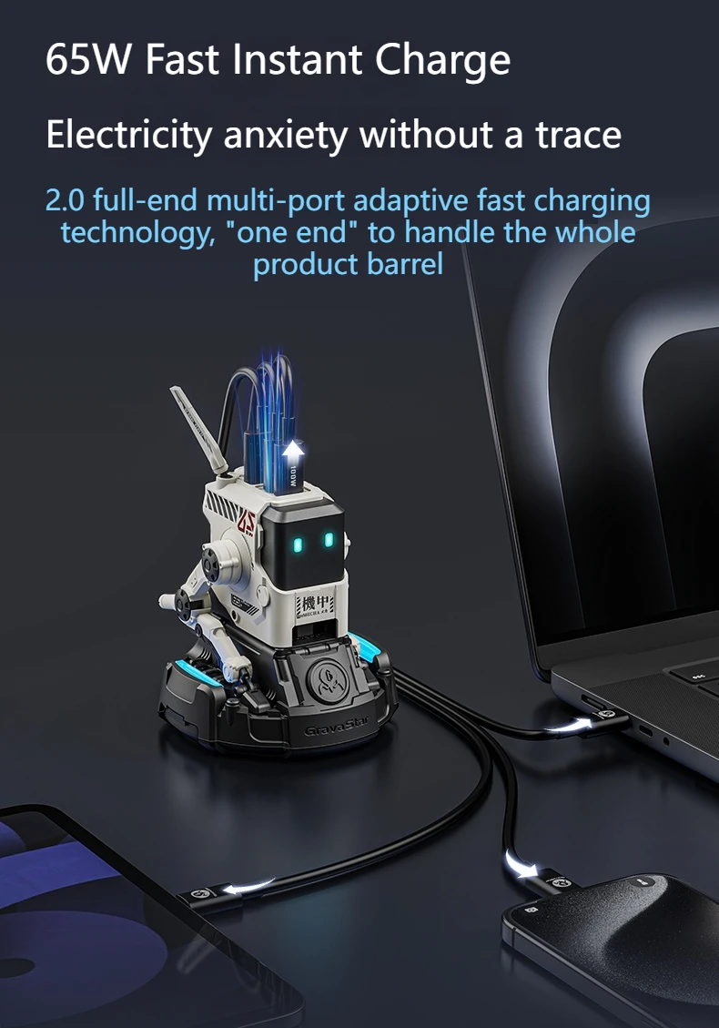 Cargador rápido GaN de tres puertos de 65W, apariencia mecánica, USB-C, protección de carga de USB-A, adecuado para QC PD, iPhone, tableta, carga de ordenador portátil